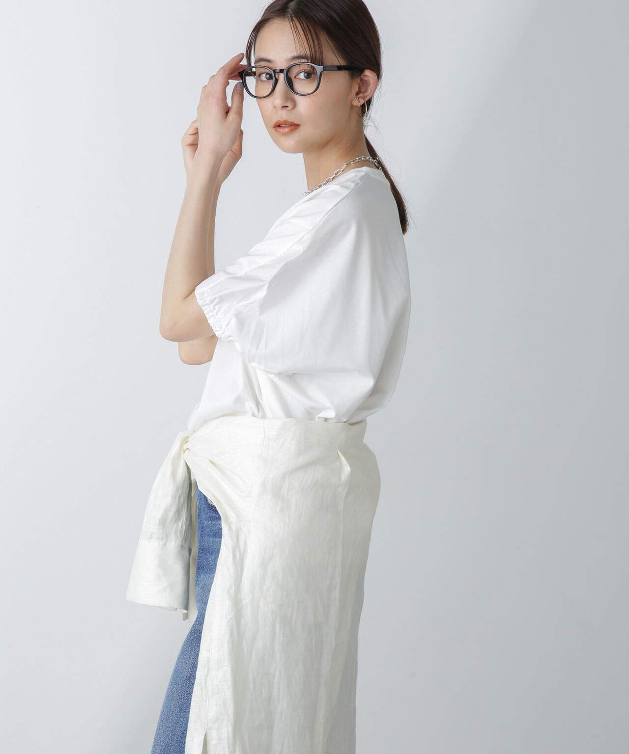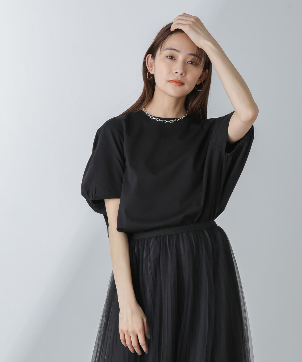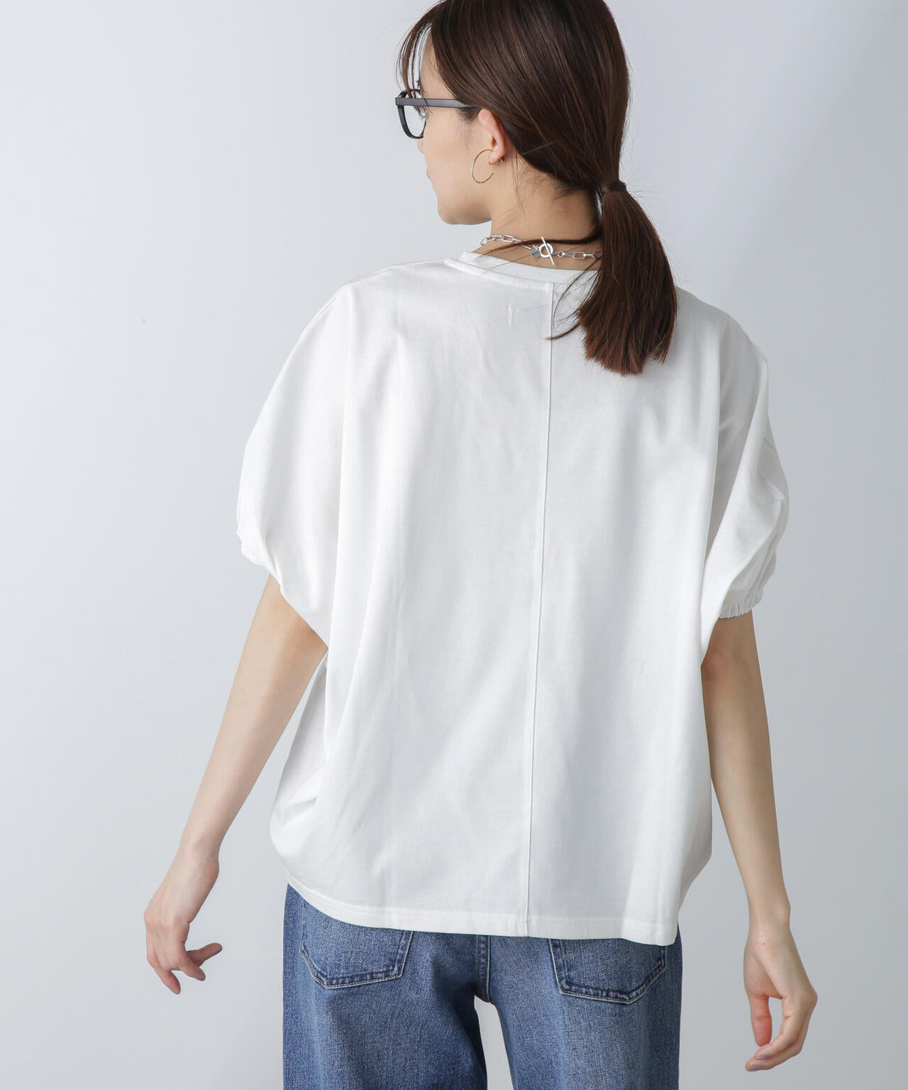 袖のフォルムデザインが魅力なカットトップス。フロントはシンプルな袖ながら、後ろはゴムでギャザーを入れた袖口でコクーンのような膨らみのあるシルエットが特徴。ハリ感のあるやや厚手の素材なので、透け感もなくオンスタイルにも最適な一枚。シンプルながらも、フォルムに特徴があるのでサラッと着ても様になるデザイン性の高いアイテムです!
