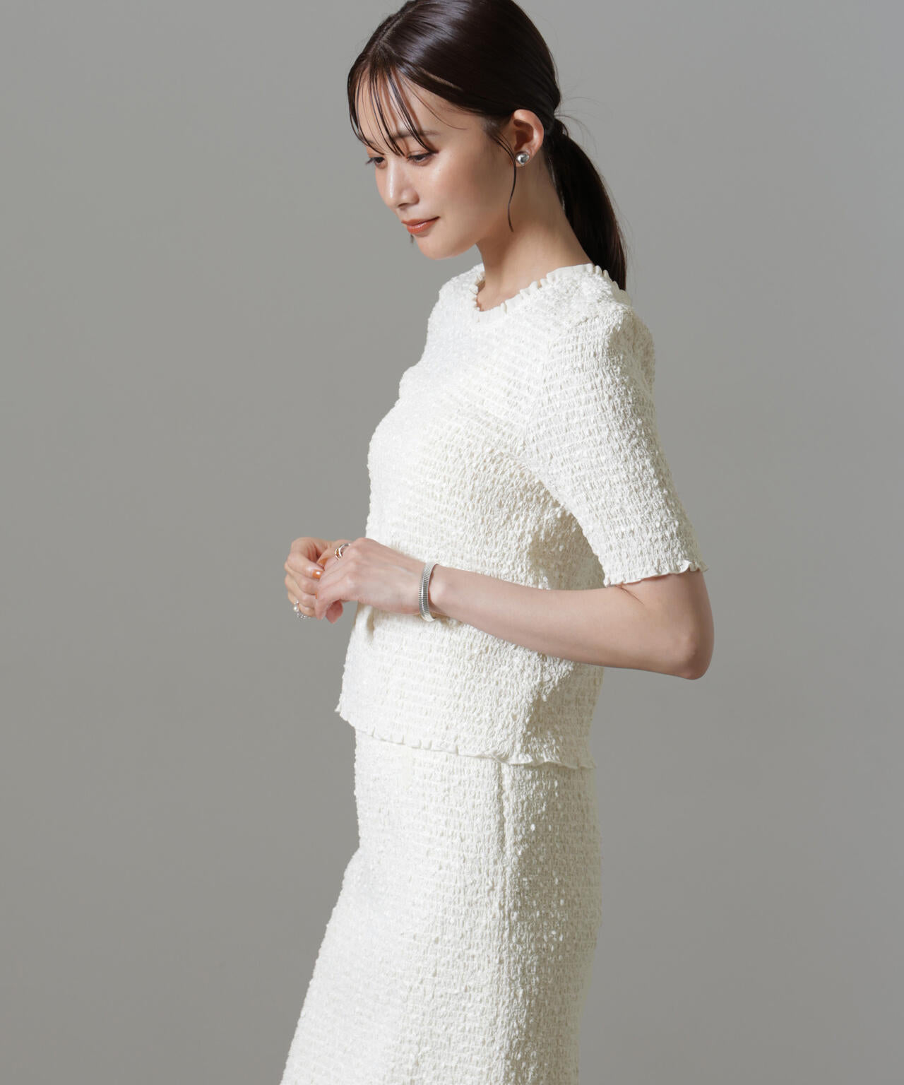 ファンシーな生地感の五分袖コンパクトトップス。後ろは大きく開いたバックオープンデザインで袖口や裾にはシフォンのフリルが特徴のディテール仕様。やや短めの丈感でアウトで着てスッキリ決まるアイテムです。イージーケアセットアップシリーズのインナーとしてキレイめな合わせにも、カジュアルなボトムスと合わせても雰囲気がまとまる一枚です。