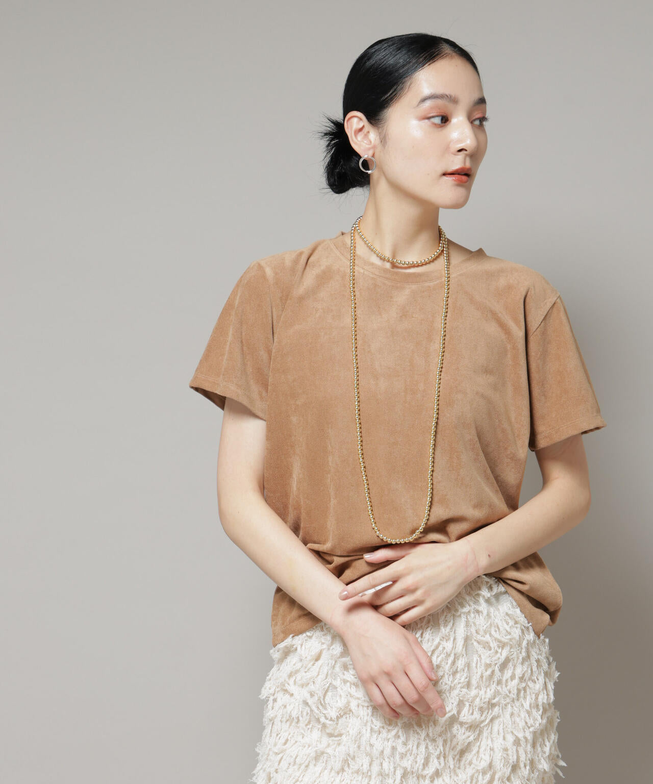 秋のシーズンムード漂うスエードライクな素材で仕立てたベーシックTシャツ。程よいゆとりを持たせ、抜け感が出るよう仕立てた絶妙なサイジングもポイント。暑い時期から重宝する半袖タイプで秋らしさを先取りできる一品です。