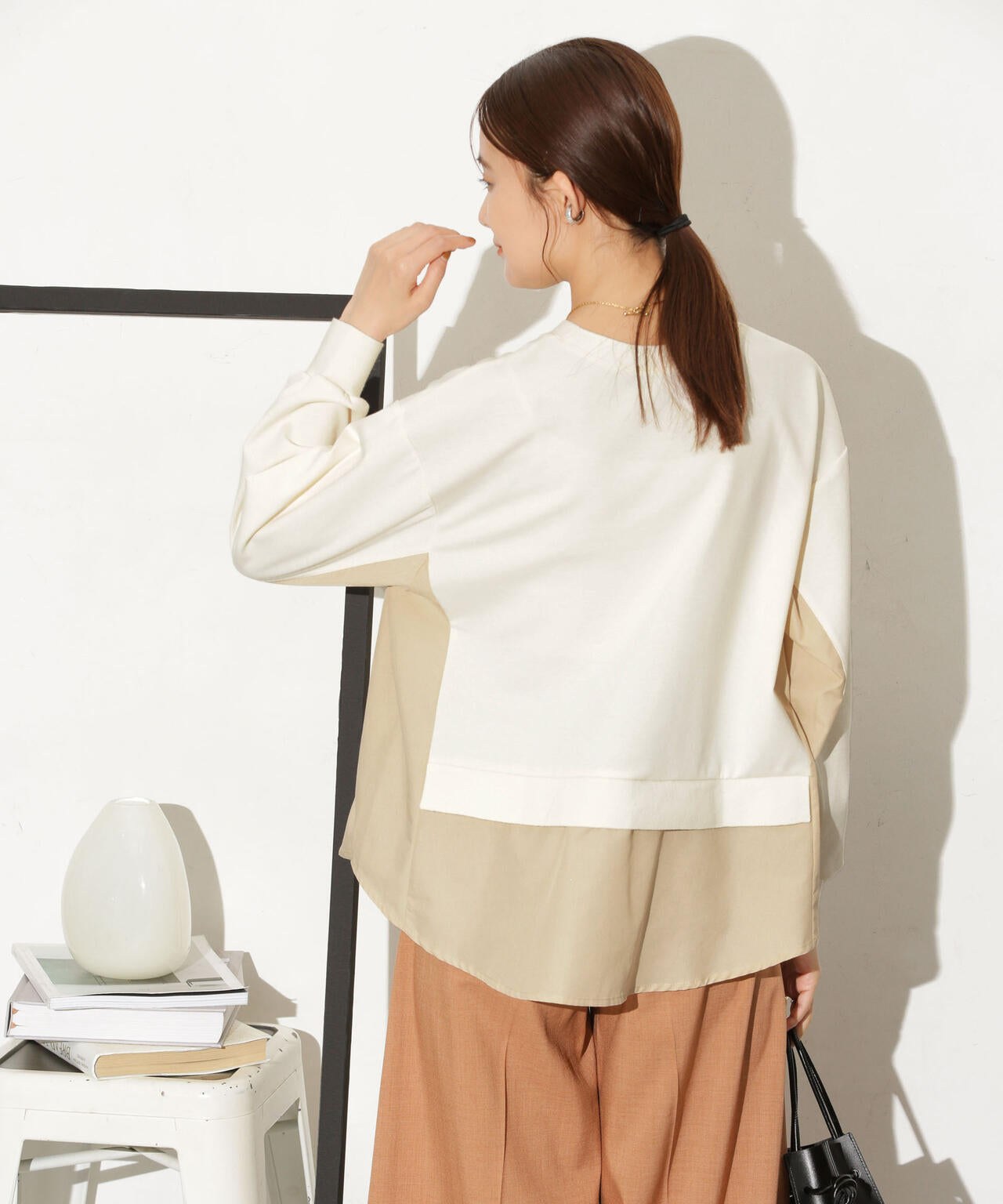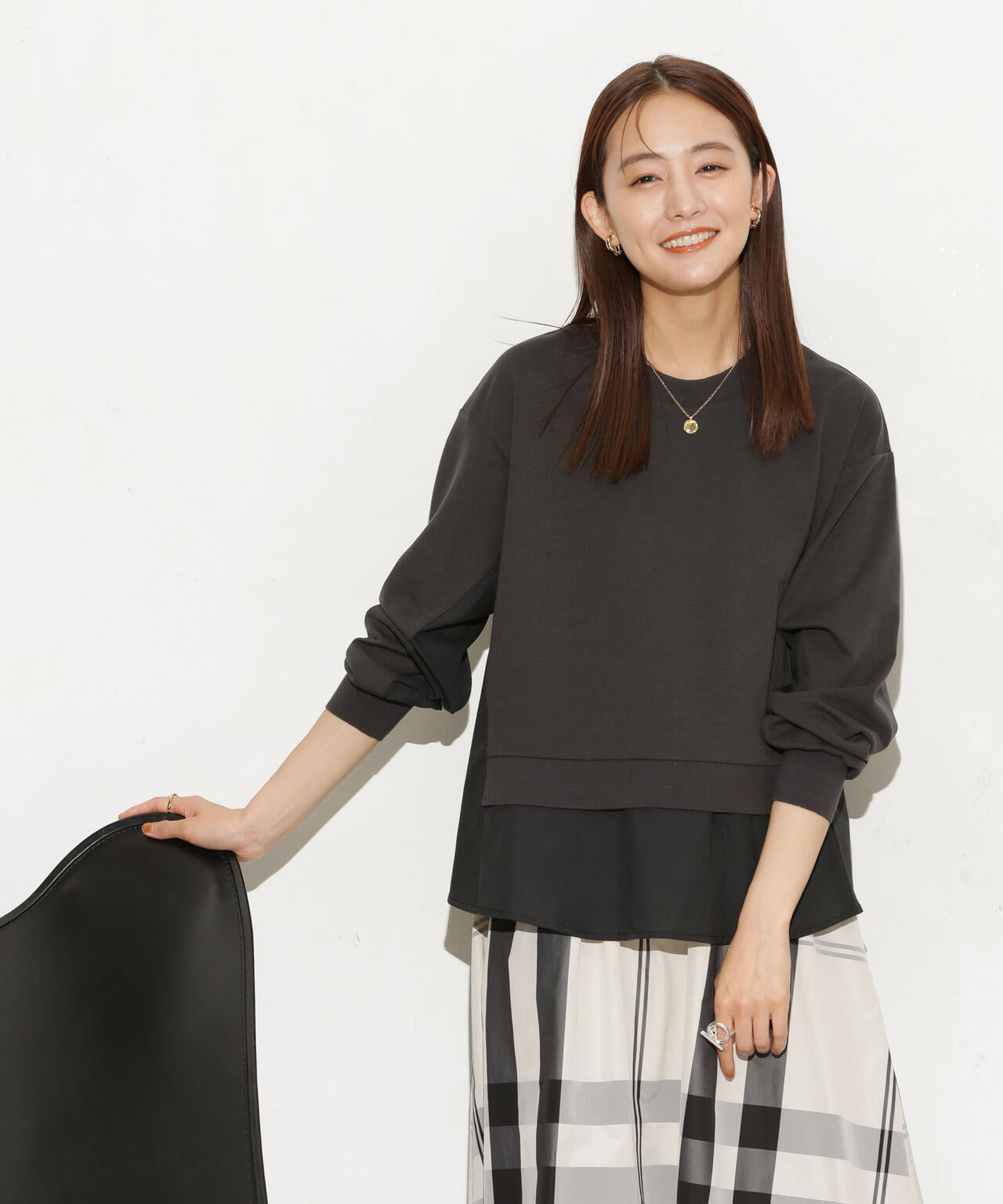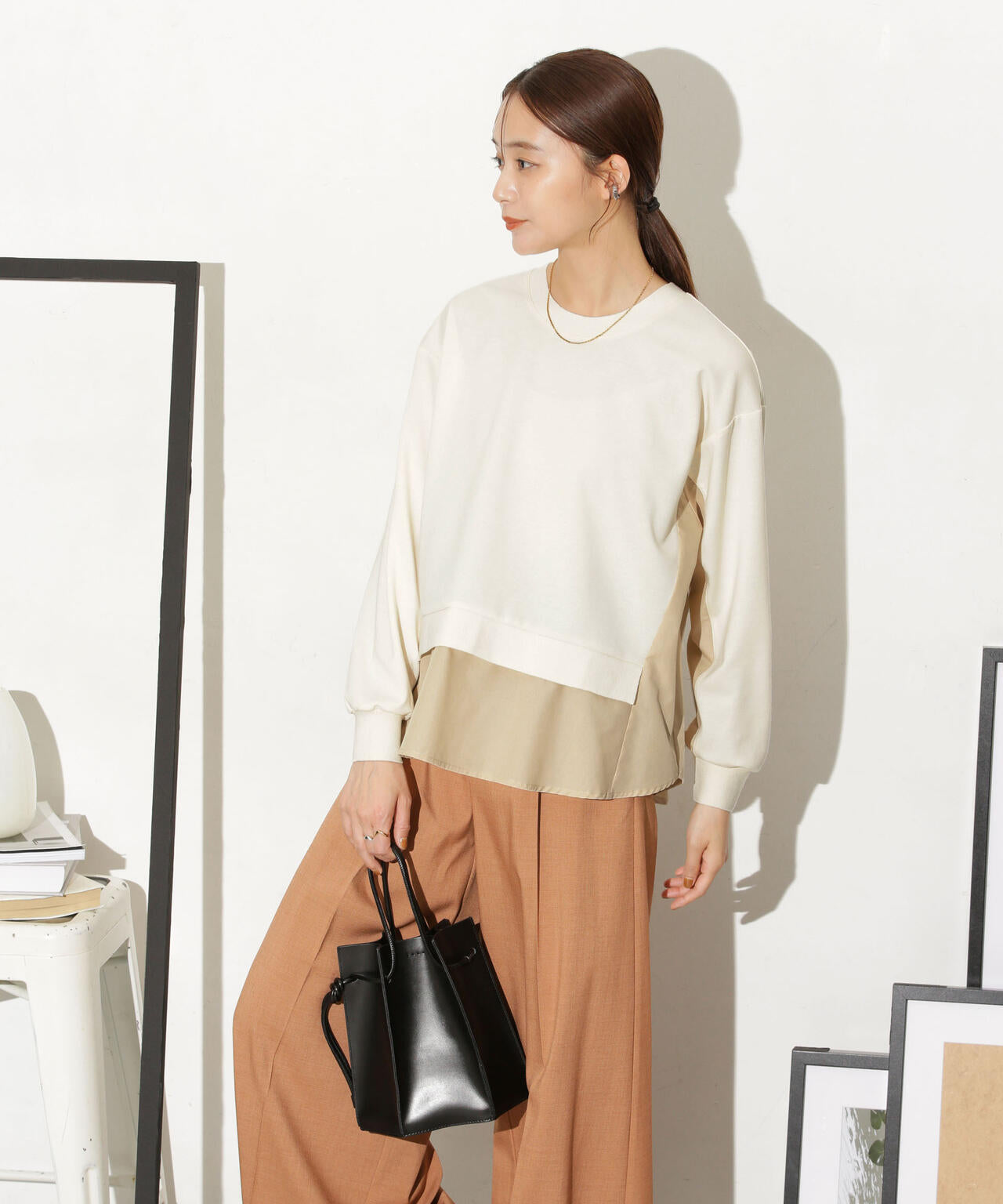 異素材コンビのデザインが様になるレイヤード風トップス。キレイ目なカットソー素材を使用し、大人な雰囲気に仕上げた1枚。落ち着いた色味でコーディネートに取り入れやすく、シンプルなテーパードパンツやタイトスカートと合わせるスタイルもおすすめです。