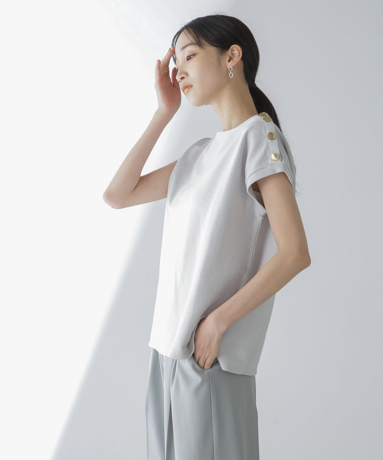 ・左肩に並べた釦ディテールがアクセントを添えるカットソー