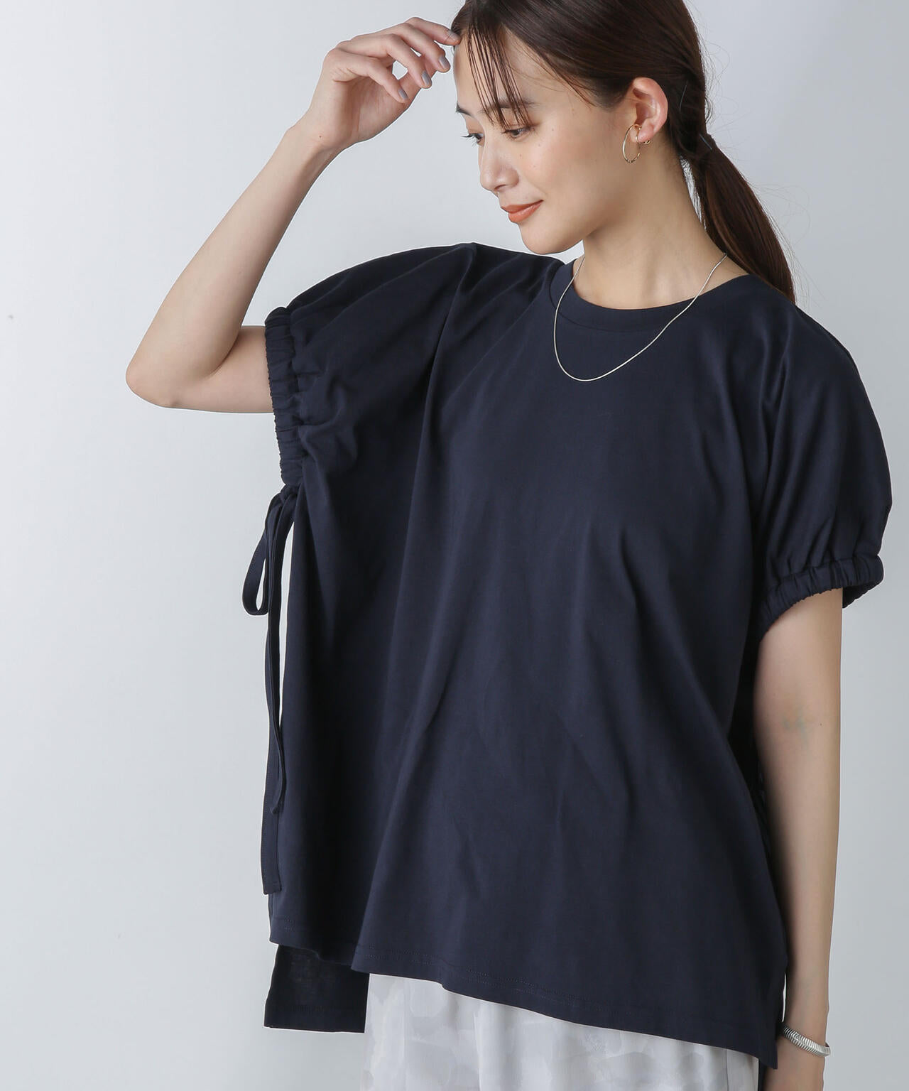 長めに垂らしたリボンが程よいアクセントを添えるデザインカットソー。身頃続きの袖に、袖口ゴム入りでギャザーを寄せた立体的なシルエットが印象的。裾アウトで細身のパンツやIラインスカートと合わせたり、裾インしてギャザースカートやワイドパンツと合わせる等幅広い着回しを楽しめる逸品です。