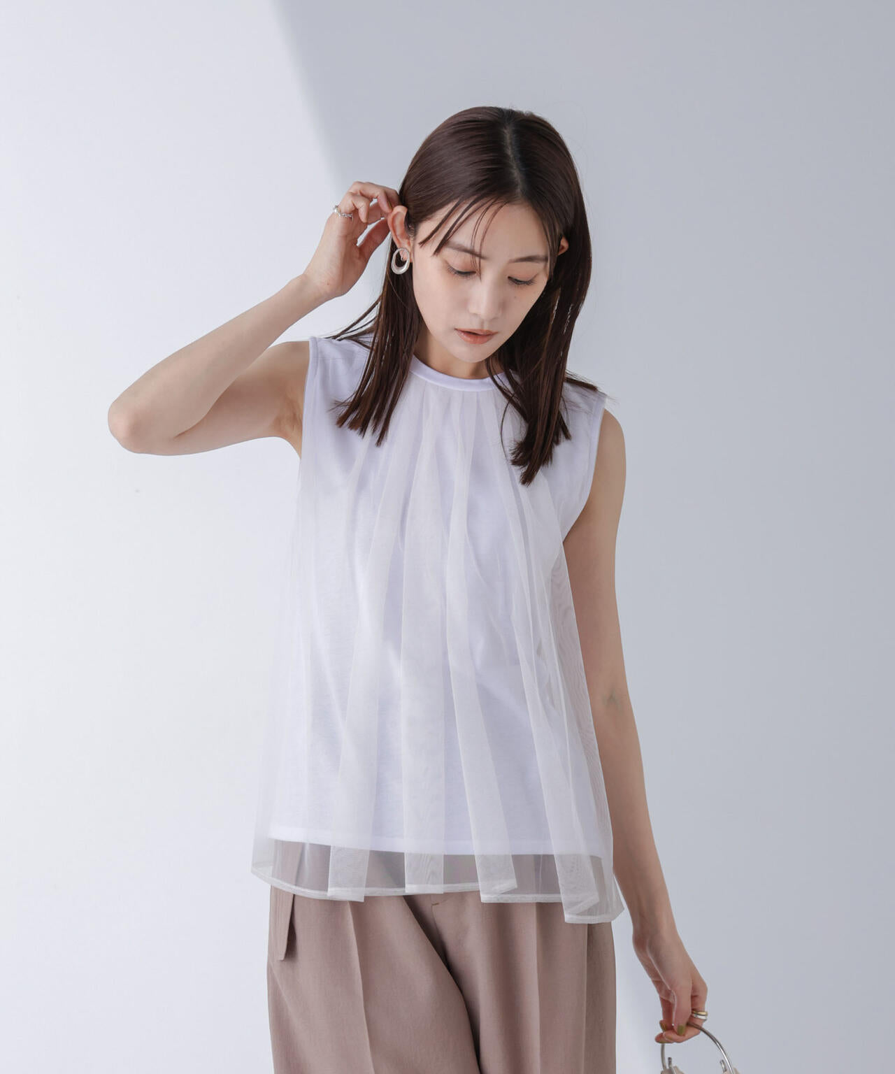 ・チュールとカットソーの異素材使いが華やかなトップス