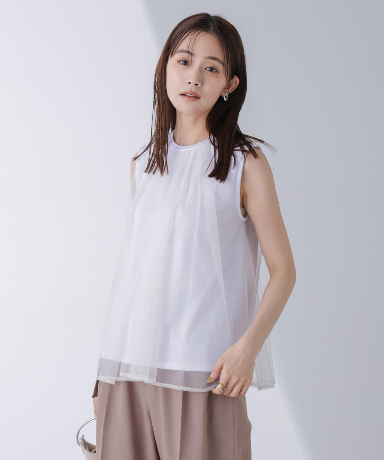 シアー感のあるチュール素材とカットソー素材をドッキングさせた、大人フェミニンなデザイントップス。フレアシルエットがエアリーな素材感と相まって、軽やかな印象に。やや長めの着丈で、体形カバーも叶えてくれます。Tシャツ感覚で着られるリラクシーな着心地ながらも、夏のスタイリングに華やかさをプラスしてくれる逸品です。