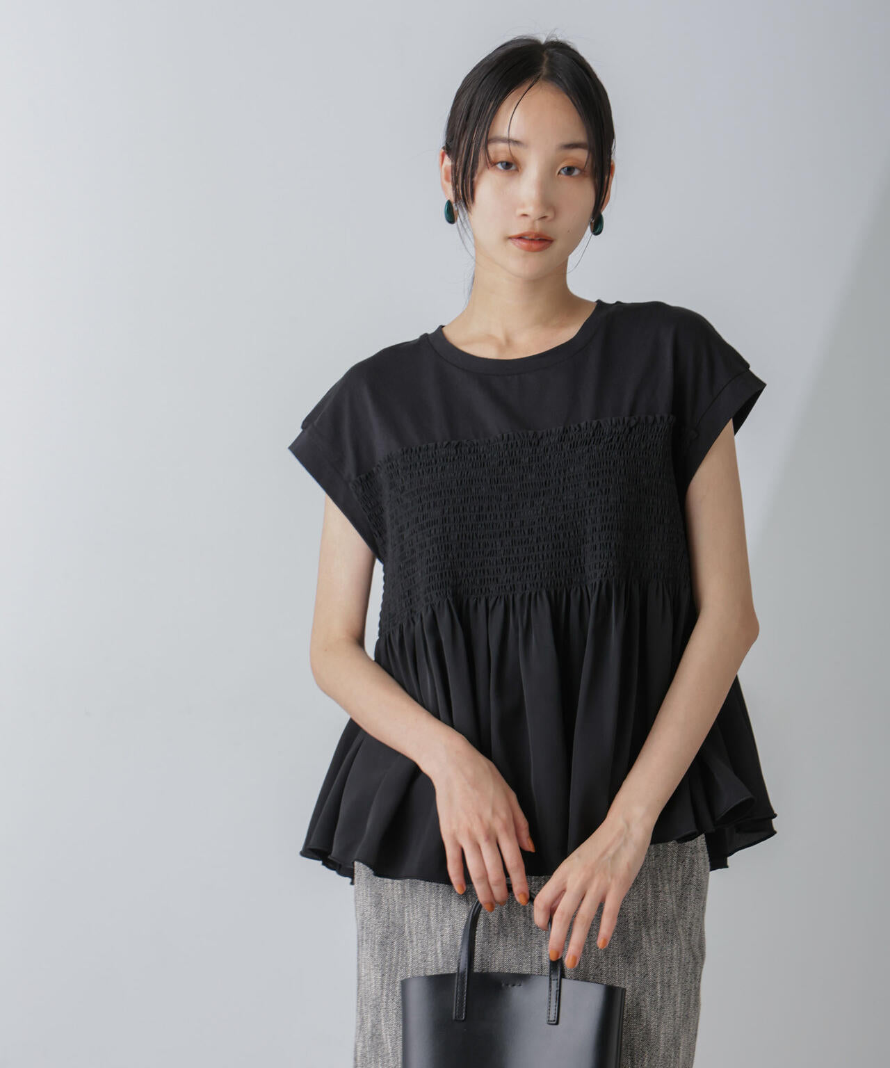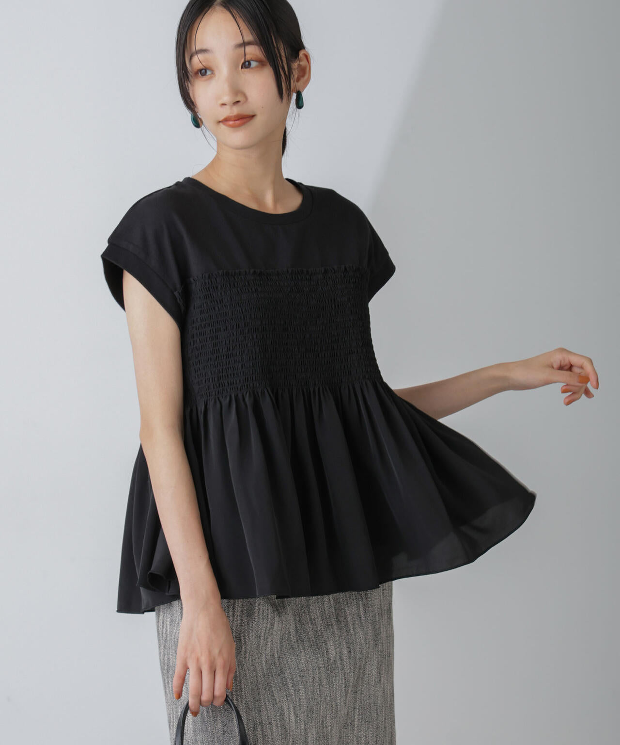 1枚で着映えするビスチェ風デザインカットトップス。シャーリングビスチェのデザインとカットソーのTシャツをレイヤードしているようなドッキング仕様が魅力的。首周りはシンプルなクルーネックで裾に広がるフレアがお腹や腰周りをカバーします。