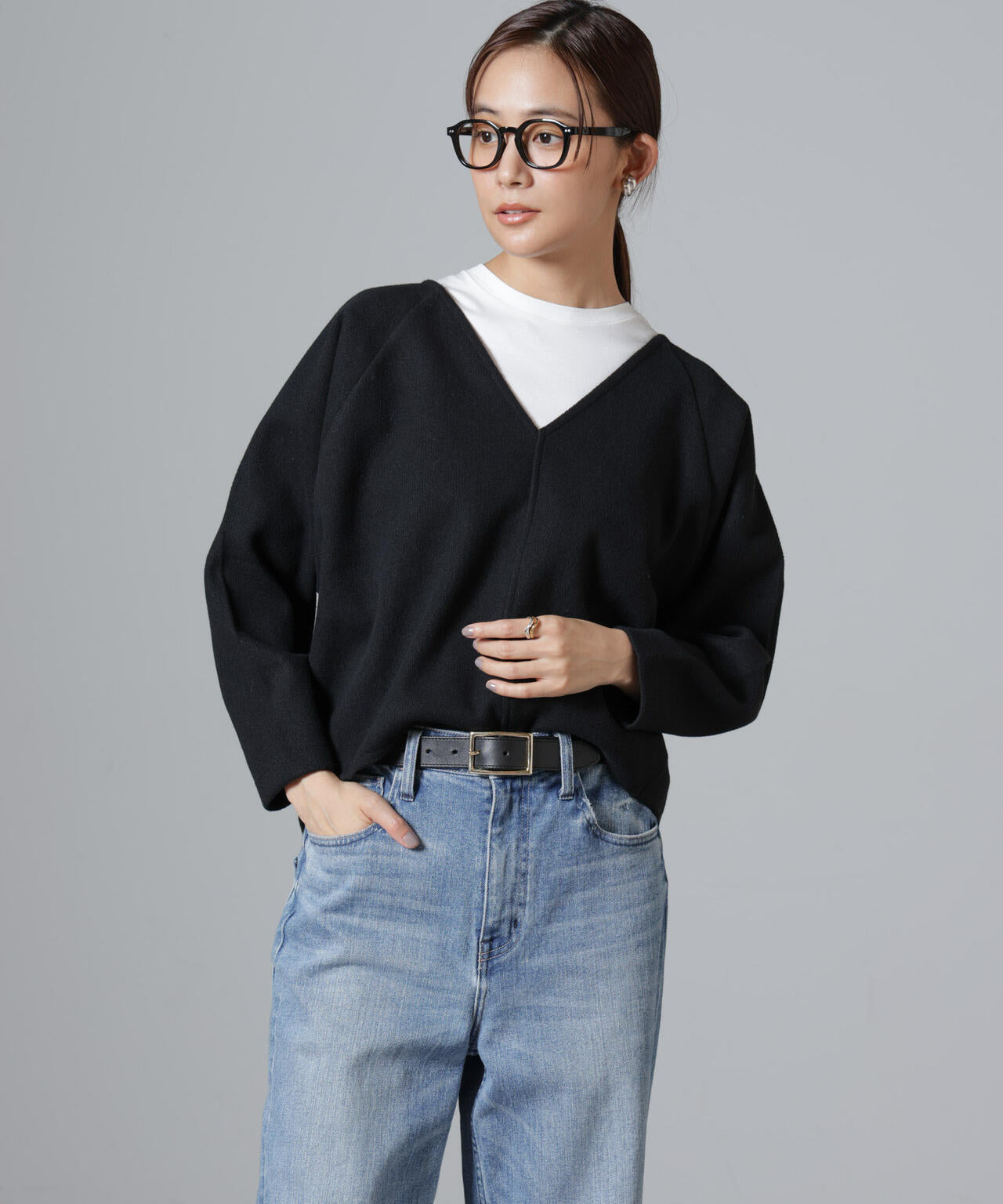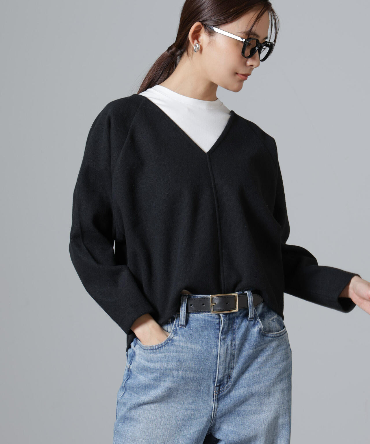 ブラウスとニットの中間のような素材感で仕立てたプルオーバー。深めのVネックと、ややワイドながら短めな着丈のトレンドライクなバランスが、端境期のレイヤードスタイルに重宝します。