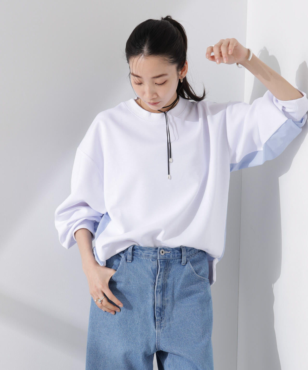 ・ポンチ素材と、布帛素材を、組み合わせたクルーネックトップス