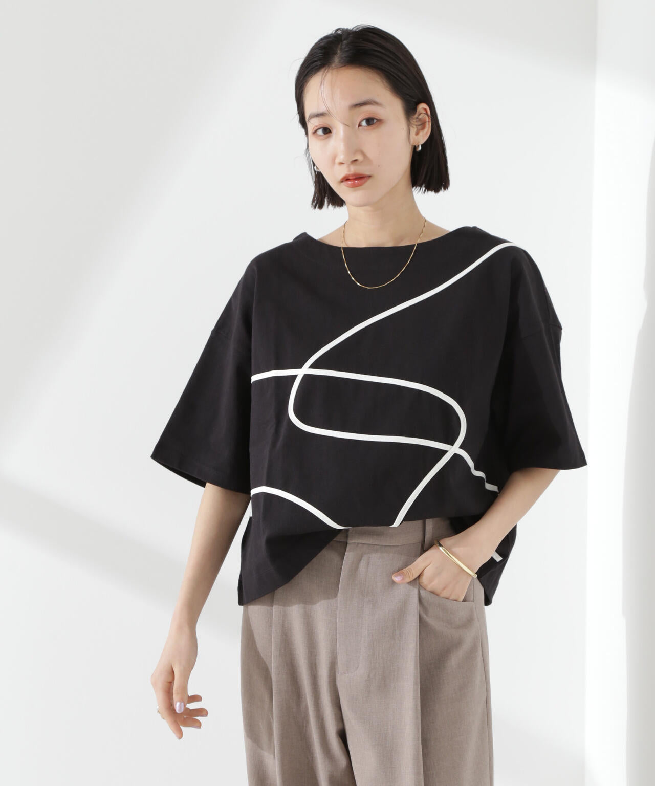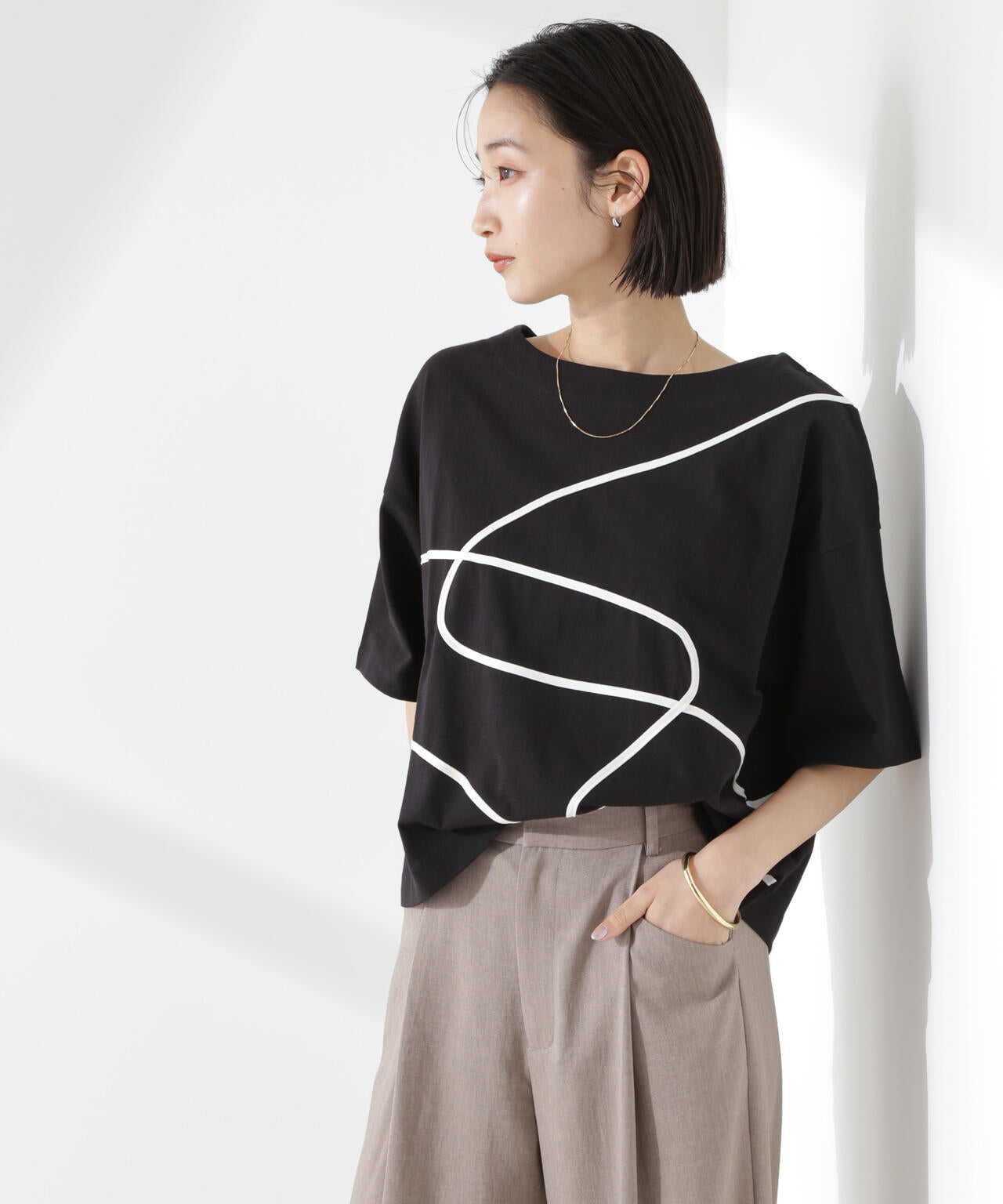 手描きアートのような曲線のデザインが、トレンド感を放つカットトップス。目を惹くデザインながらも取り入れやすいシルエットと程よい着丈感で合わせるボトムを選ばず、いつものスタイルに鮮度をプラスしてくれる逸品です。