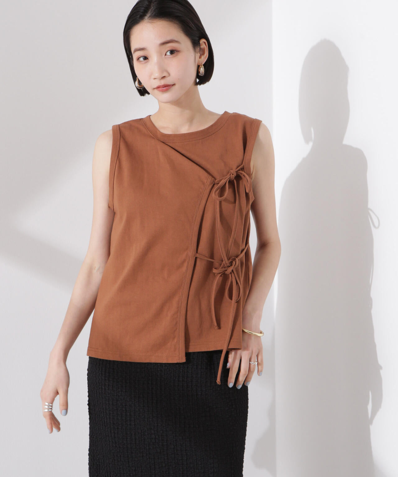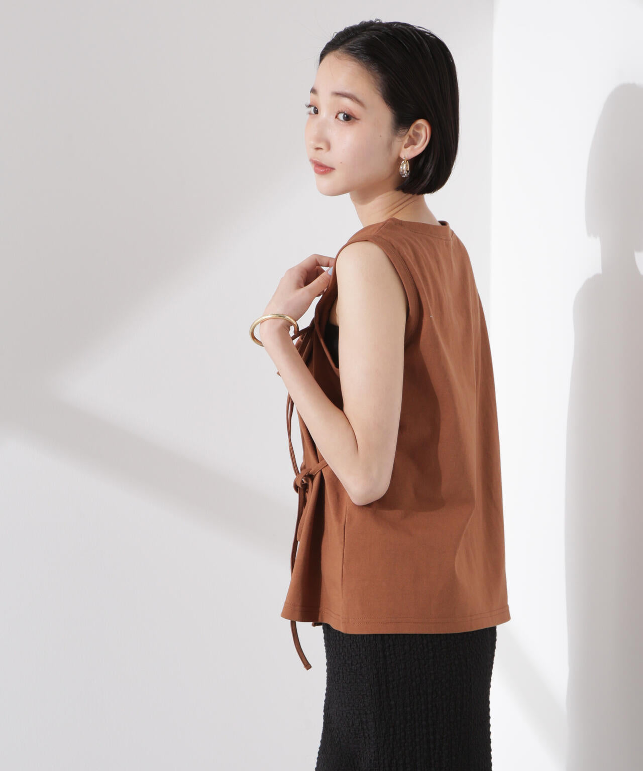 ・フロントに施されたリボンディテールが女性らしい印象のノースリーブトップス