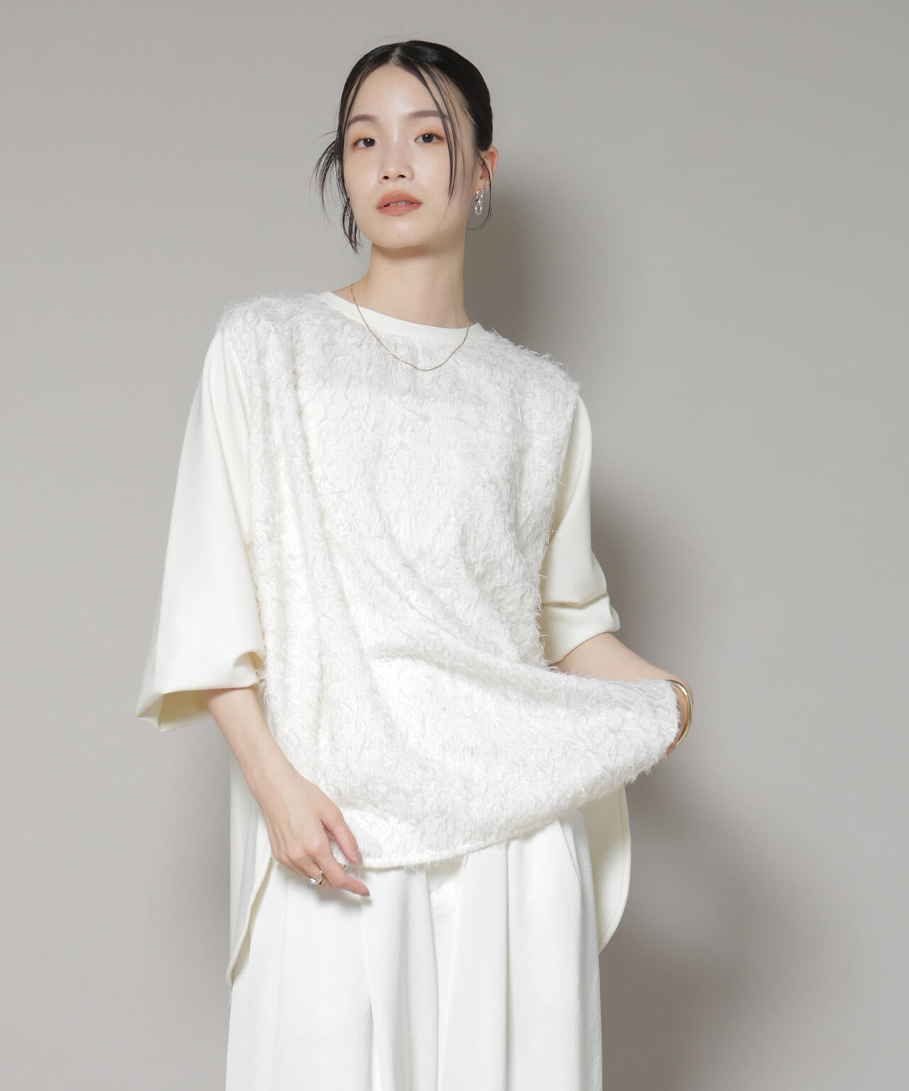 ジャガードとカットジョーゼットのコンビ素材でデザインされたプルオーバー。きちんと感がありながら着映えしてくれるので、ジャケットやジレ、ワンピースのインナーにも重宝する一品です。