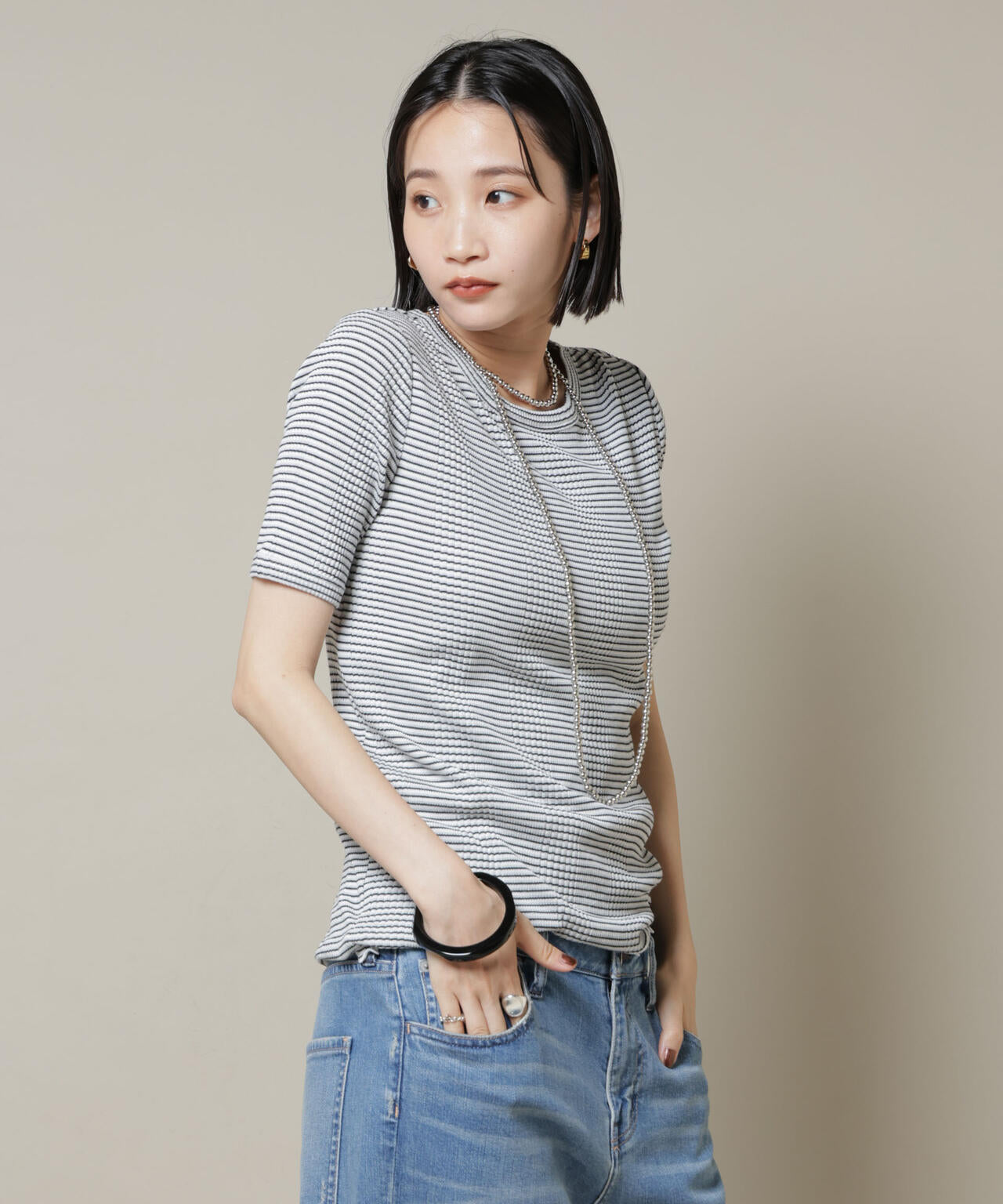 ・甘すぎない印象の細ピッチのボーダー柄